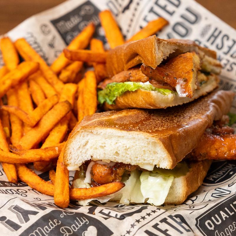 Golden fried chicken breast, tossed in our homemade honey and butter sauce, dill pickles, lettuce and tomato on Cuban bread