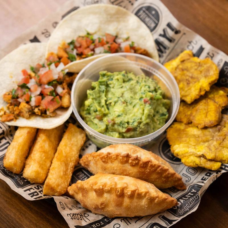 2 Empanadas, 2 Tacos, Tostones, Guacamole & Potato Balls | Add 2 Chicken Pinchos for $5